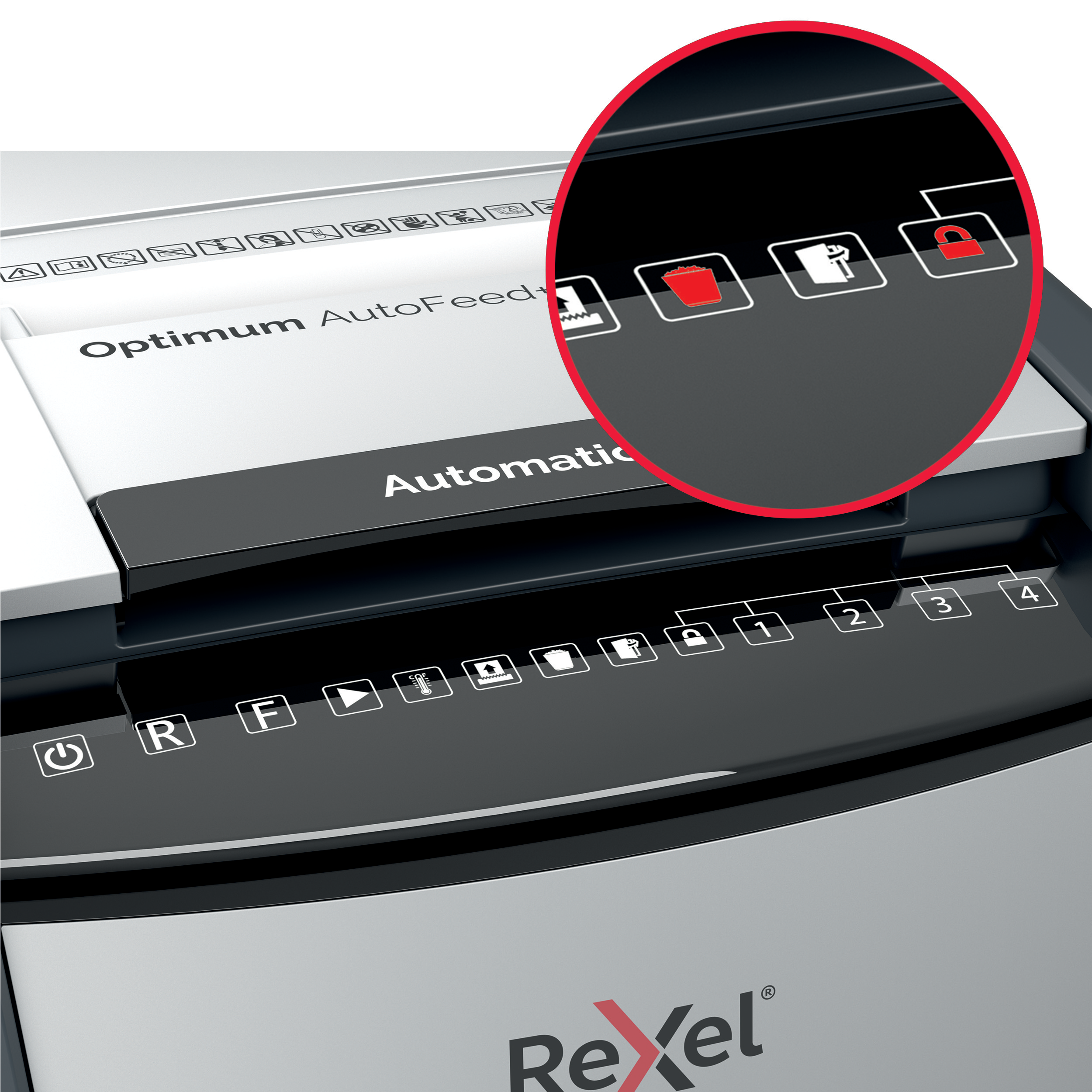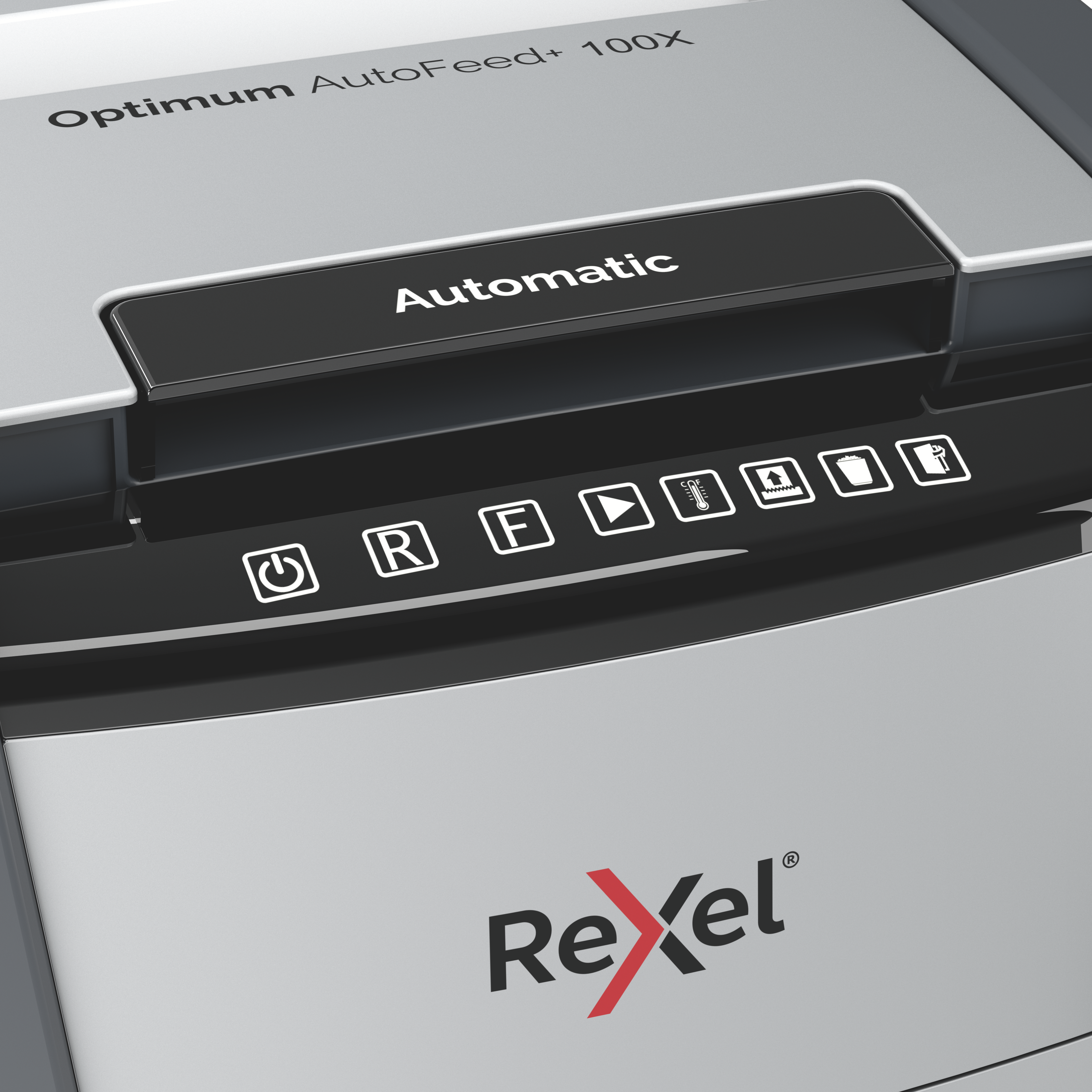 Distrugatorul automat pentru documente Rexel Optimum AutoFeed+ 100X distruge automat 100 coli A4 (80 gsm) dintr-o singura incarcare, in bucati de 4x28mm (P-4, cross cut).